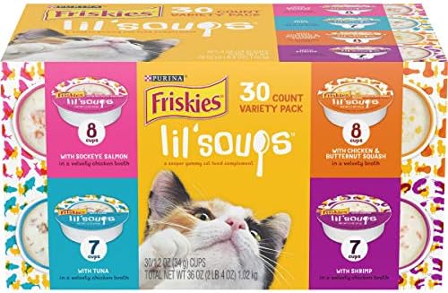 Purina Friskies Grain Free Wet Cat Food Complement Variety Pack Lil Soups Salmon Tuna Chicken Shrimp 30 Count Pack Of 1 Amazon Co Uk Pet Supplies